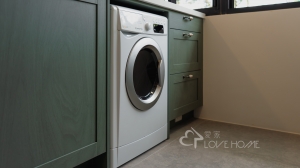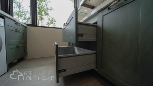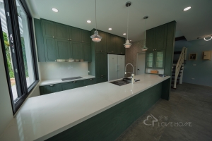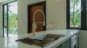 大面積窗景引光納景,將山林綠意化為日常背景。 霧面綠色櫥櫃沉穩優雅,搭配俐落中島動線, 以簡約設計展現細膩質感, 勾勒出專屬於生活的高雅廚房美學。