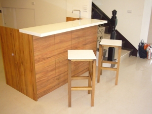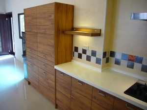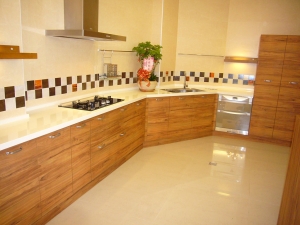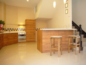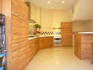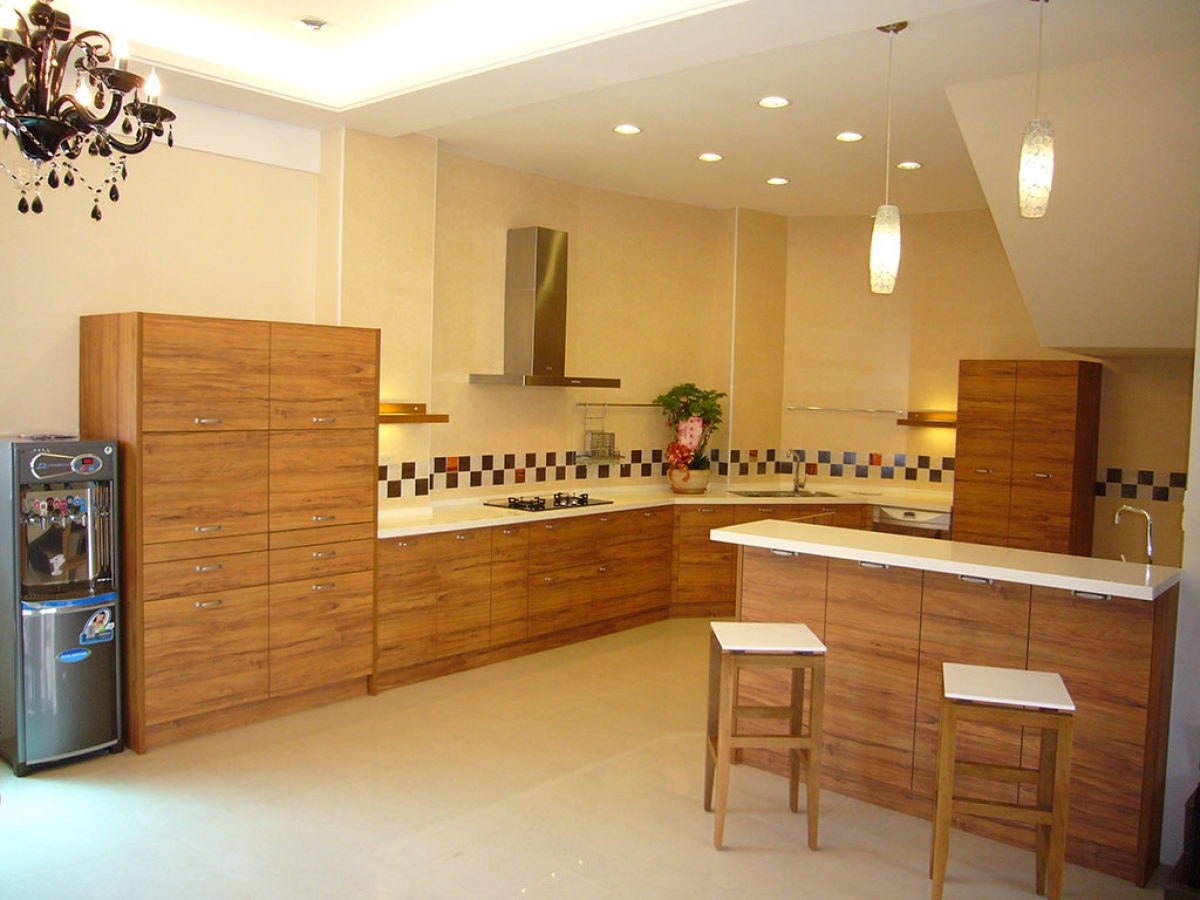 我的廚房會轉彎,運用木紋做橫向設計,把空間做到無限延伸的美學感